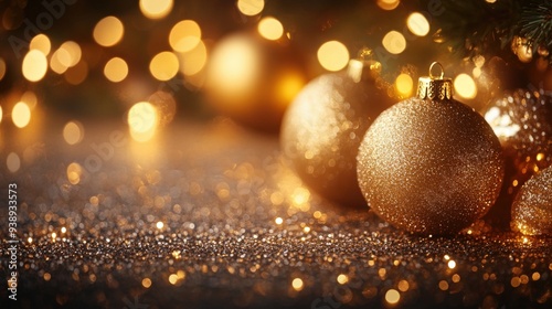 © Naret, Fototapeta premium Golden LED lights reflecting off holiday ornaments, creating a cozy, warm glow
