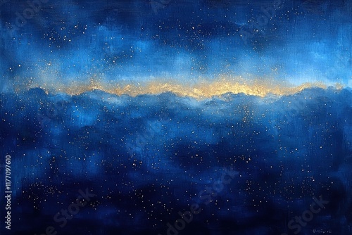 © Fiva, Obraz premium Golden light breaking through dark blue, starry night sky over misty mountain range, suitable for calming backgrounds