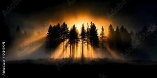 © DesignByGade, Fototapeta premium Golden light breaks through a misty forest.