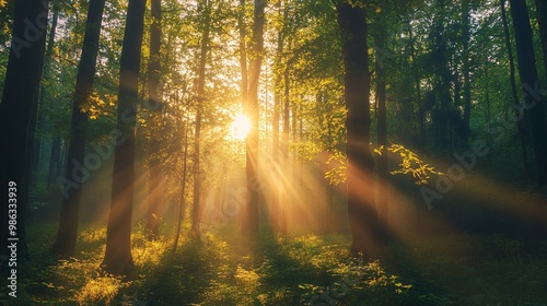 © Koplexs-Stock, Fototapeta premium Golden Light Filtering Through a Dense Forest at Sunset