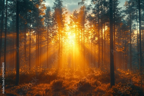 Obraz premium Golden Light Filtering Through a Dense Pine Forest