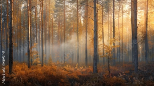 Fototapeta premium Golden Light Filtering Through Fog in a Pine Forest