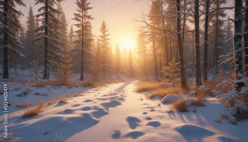 © Prasert, Naklejka premium Golden light filters through snowflakes as dawn breaks over the forest , snow, solstice, illumination