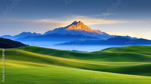 Fototapeta premium Golden light illuminates a majestic mountain range over green fields