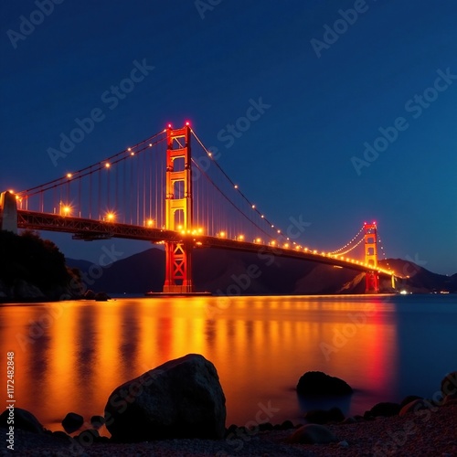 Obraz premium Golden light illuminating the red bridge at night, night, landscape