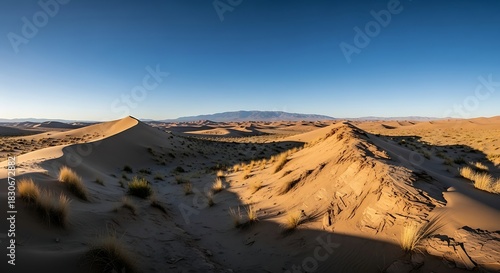 Naklejka premium Golden Light on Expansive Desert Dunes and Distant Mountains