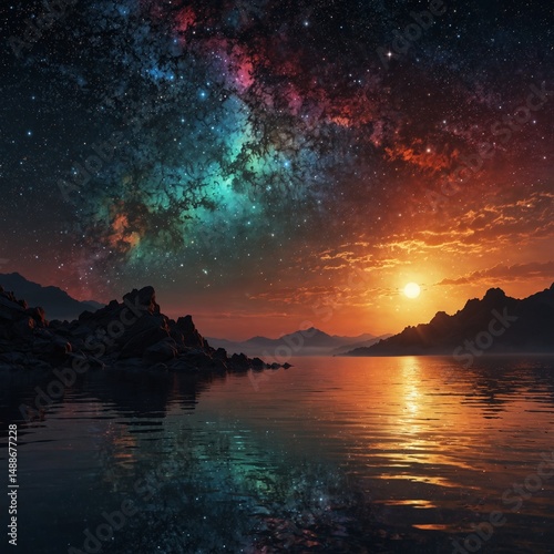 © M, Fototapeta premium Golden light painted the evening sky with hues of orange and red as the sun dipped below the horizon, reflecting beautifully on the calm sea, ocean, and lake waters