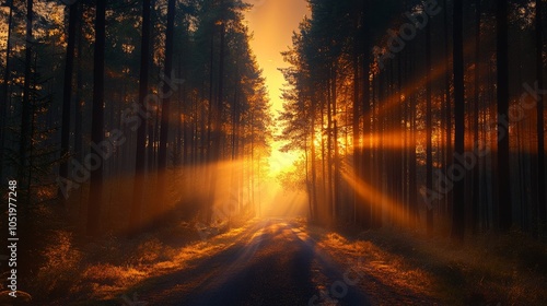 © Panupan, Obraz premium Golden Light Through Forest Trees and Path
