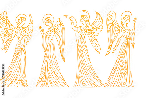 Obraz premium Golden line art illustration depicting a choir of four angels singing,...