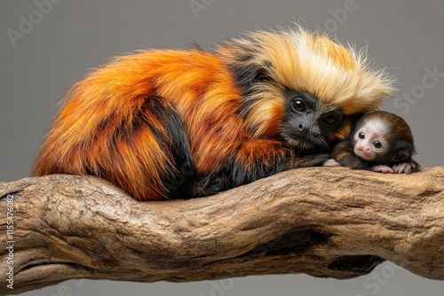Naklejka premium Golden lion tamarin protecting its baby on a branch
