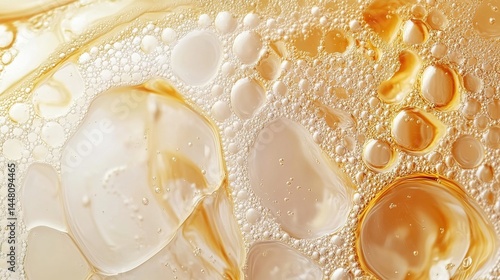 © YONG, Fototapeta premium Golden liquid with transparent bubbles on soft background.