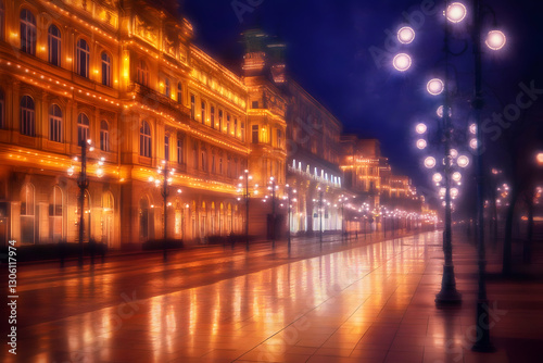 © Siasart, Fototapeta premium Golden Lit City Street Photo Reflection Of Buildings At Night With