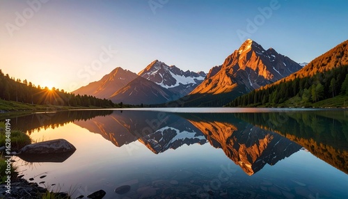 Fototapeta premium Golden-lit mountain peak reflected in tranquil lake—sunrise or sunset glow,...