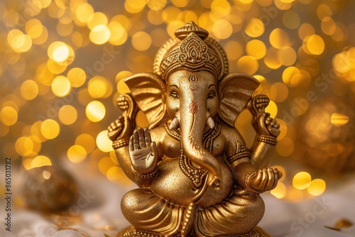 © Neha, Fototapeta premium Golden Lord ganesha sculpture with bokeh background
