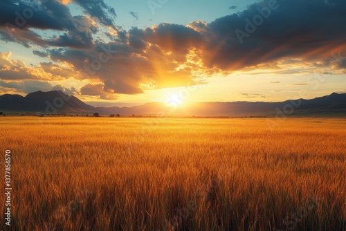 © Роман Булатов, Obraz premium Golden maize crops stretch across the landscape in Kenya as the sun sets, casting warm hues over the field and highlighting the rural beauty Generative AI