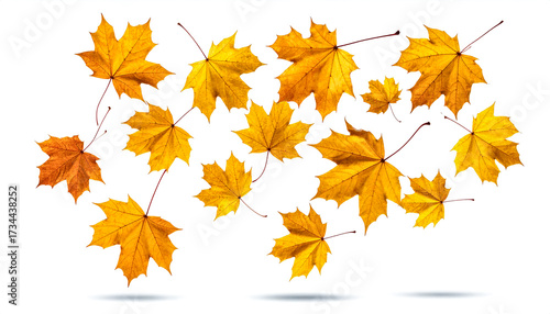 Fototapeta premium Golden maple leaves falling gracefully on pure white background