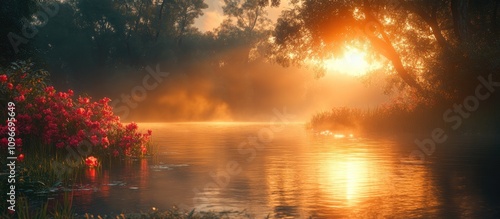 © CreativeBro, Obraz premium Golden morning glow illuminating serene river landscape with vibrant flowers and misty reflections in tranquil nature setting.