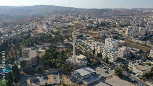 Naklejka premium Golden Mosque Tower Minaret in Beit Hanina, Aerial view Palestinian Muslim...