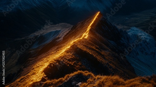© Sarina, Fototapeta premium Golden mountain ridge path sunrise aerial landscape