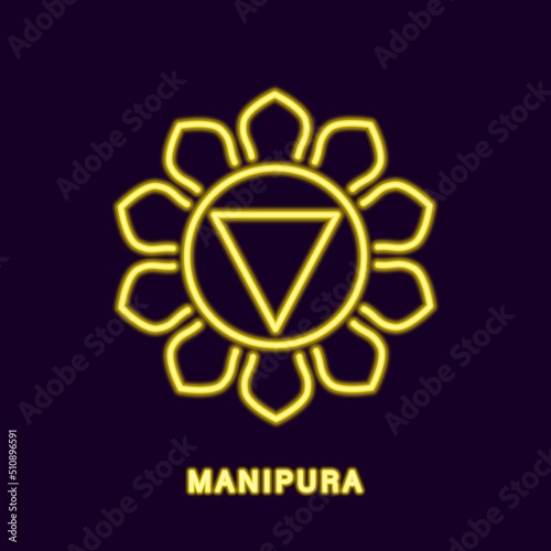 © IRYNA, Fototapeta premium Golden neon manipura chakra. Luminous yellow symbol of knowledge of body structure and power over desires. Nabhishthana remedies for illness and permanent vector happiness