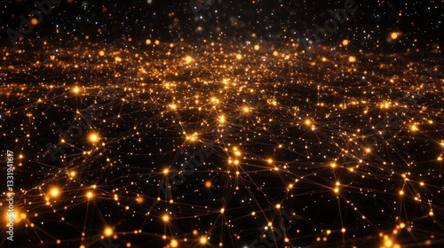© gentho, Fototapeta premium Golden network connections forming a constellation-like pattern on a dark background.