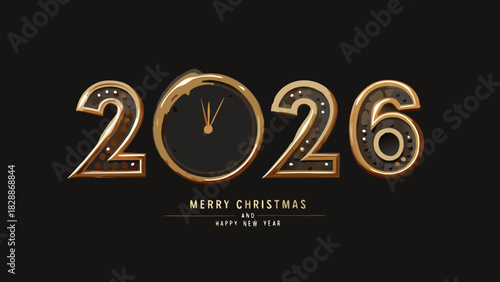 Fototapeta premium Golden 2026 new year clock with christmas greetings on black background