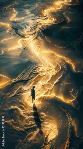© jinzhen, Obraz premium Golden ocean futuristic architectural scene abstract poster background