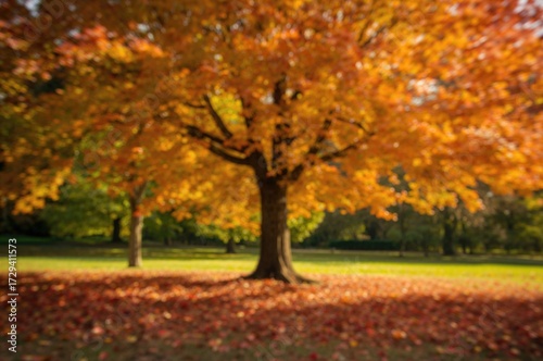 Naklejka premium Golden October day outdoors with sunlit autumn leaves and a blurred scenic...