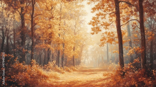 © Napasnan, Fototapeta premium Golden-orange light filtering through autumn leaves, creating a warm, serene forest scene.