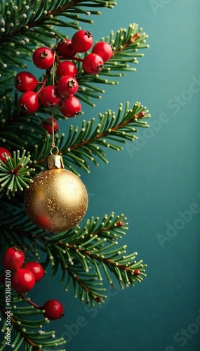 Fototapeta premium Golden ornaments and bright red berries adorn frosty pine branches in a stunning arrangement of color and texture, festive, evergreen, pine