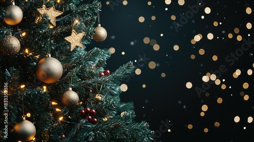 Fototapeta premium Golden ornaments hang from green branches, creating a warm and festive...