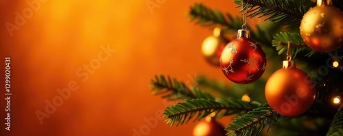 Fototapeta premium Golden ornaments on a bright orange Christmas tree, Christmas Tree, Sparkly