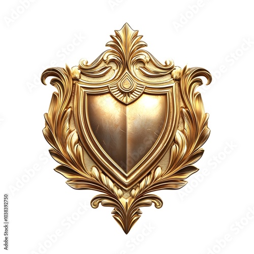 © Borasca, Fototapeta premium Golden ornate shield emblem with intricate baroque patterns on white background