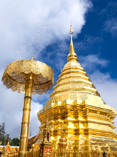 Fototapeta premium Golden pagoda of Wat Phra That Doi Suthep under cloudy blue sky
