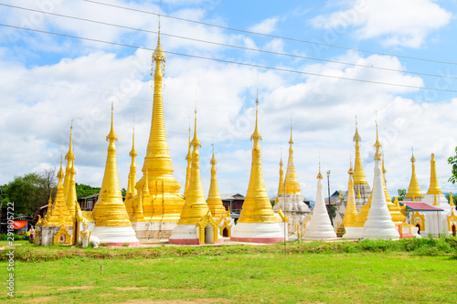 © jon_chica, Naklejka premium golden pagodas at inle lake, myanmar