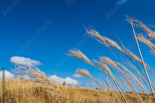 © Akarat, Obraz premium Golden Pampas Grass Swaying in the Wind Under a Clear Blue Sky in Autumn