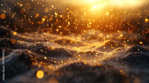 © afif, Naklejka premium Golden particles floating over a wavy surface at sunset.