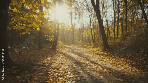 © adha, Obraz premium Golden Path: Sunlit Forest Trail in Autumn with Fallen Leaves and Silhouetted Trees