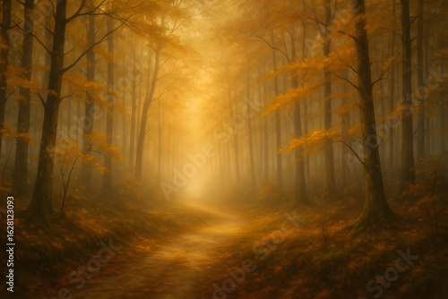 © Julia Zubrytskaya, Obraz premium Golden Path Through a Misty Autumn Forest: A Serene and Mysterious Landscape