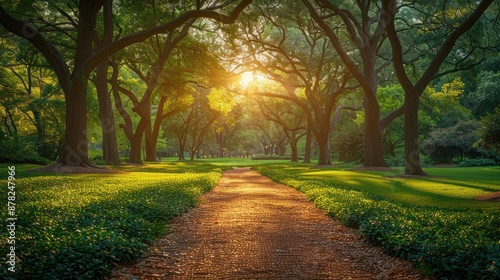 © vixion, Naklejka premium Golden Path Through a Serene Forest