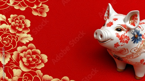 © uuhouse, Obraz premium golden pig, solid red background, copy space