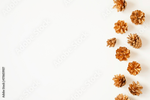 Fototapeta premium Golden pine cones on white backdrop