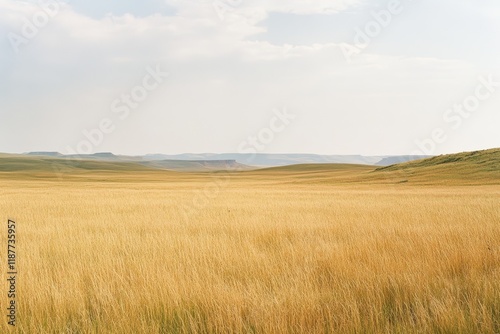 © Atmospheric stock, Obraz premium Golden prairie landscape with rolling hills under clear sky