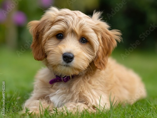 Fototapeta premium Golden puppy rests in lush grass