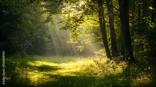 Obraz premium Golden rays illuminate a tranquil forest clearing on a serene morning in summer
