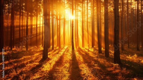Fototapeta premium Golden Rays of Sunlight Piercing Through a Forest
