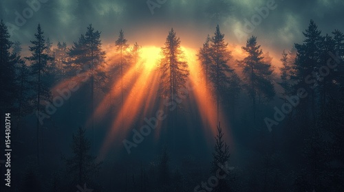 © Graciel, Fototapeta premium Golden rays piercing a misty forest.