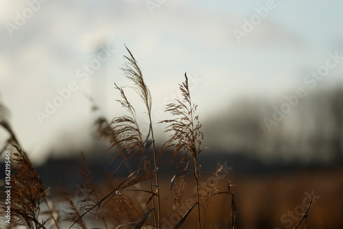 Fototapeta premium Golden reeds sway gently in the breeze beside a tranquil waterway during late...