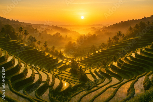 © IOI, Naklejka premium Golden Reflections: The Beauty of Terraced Fields at Dawn