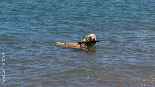 © TanerMuhlis, Obraz premium Golden retriever playing fetch in the sea on a summer day